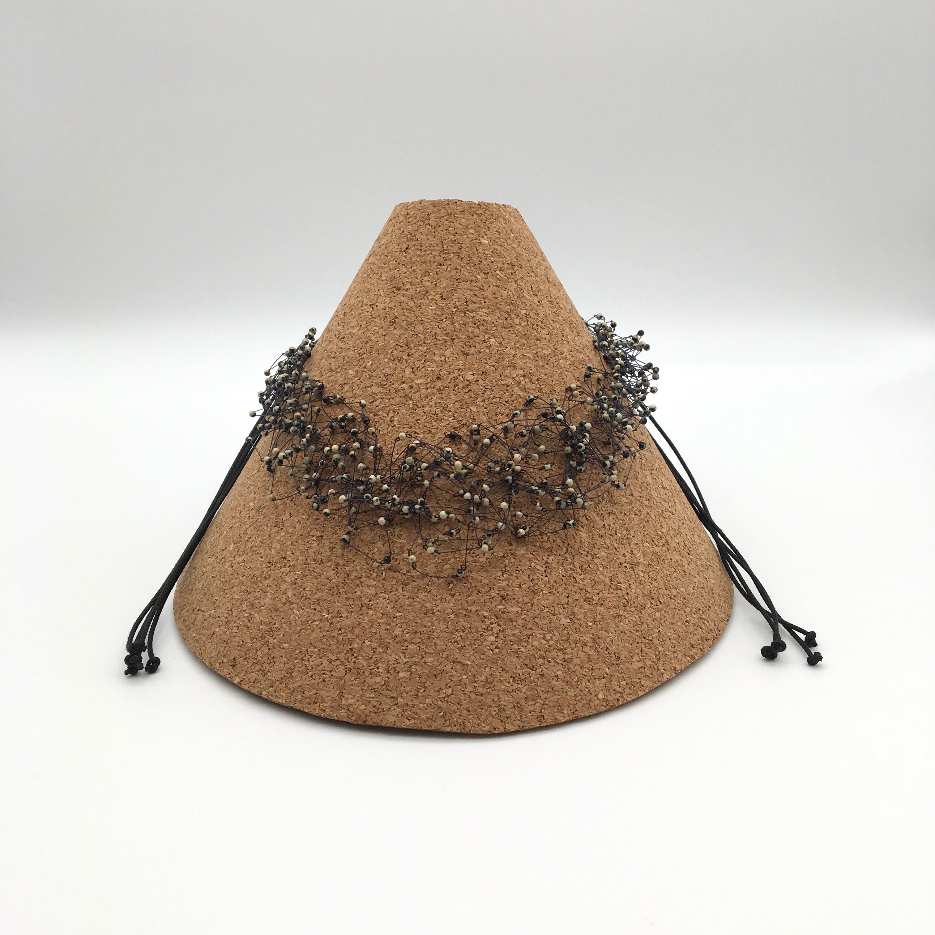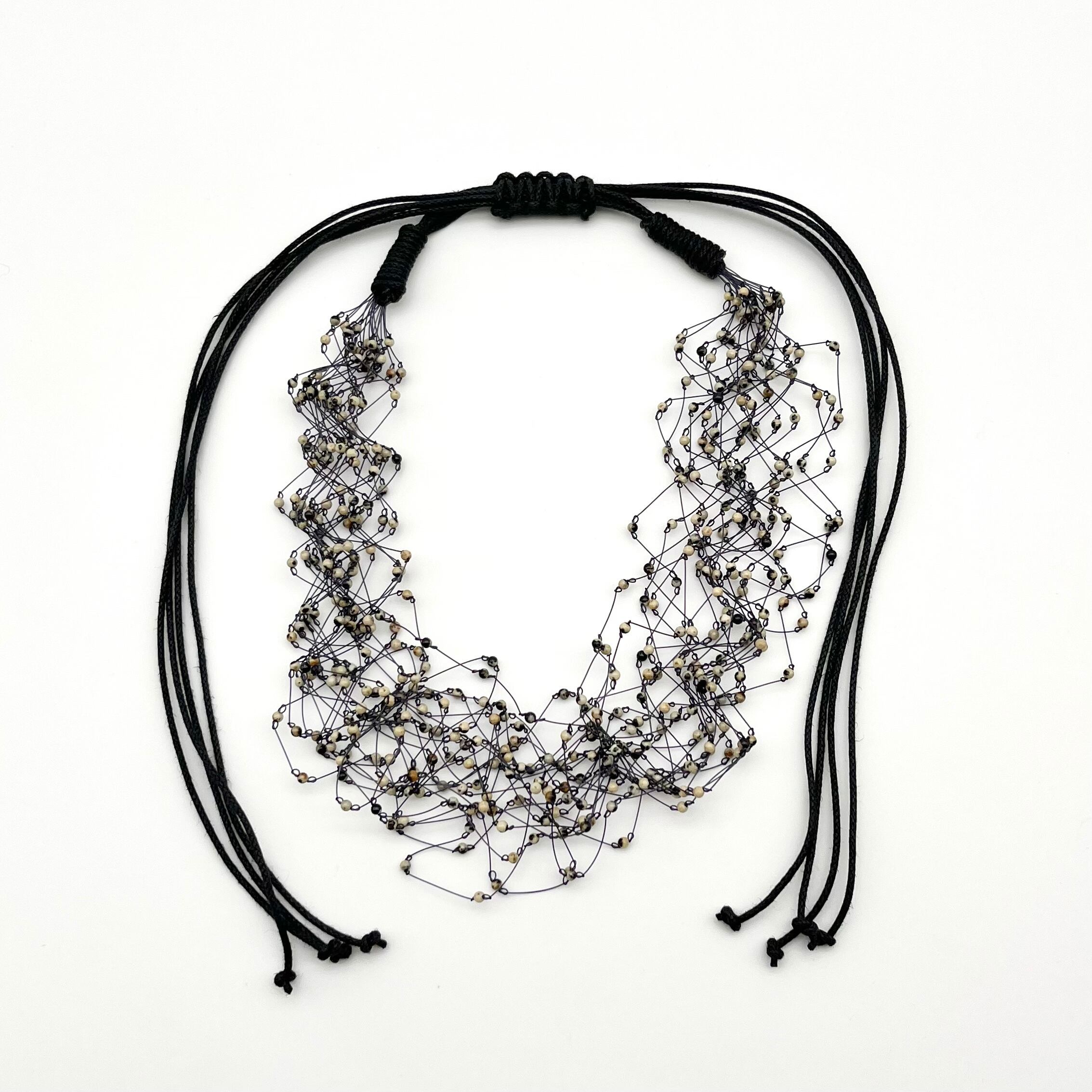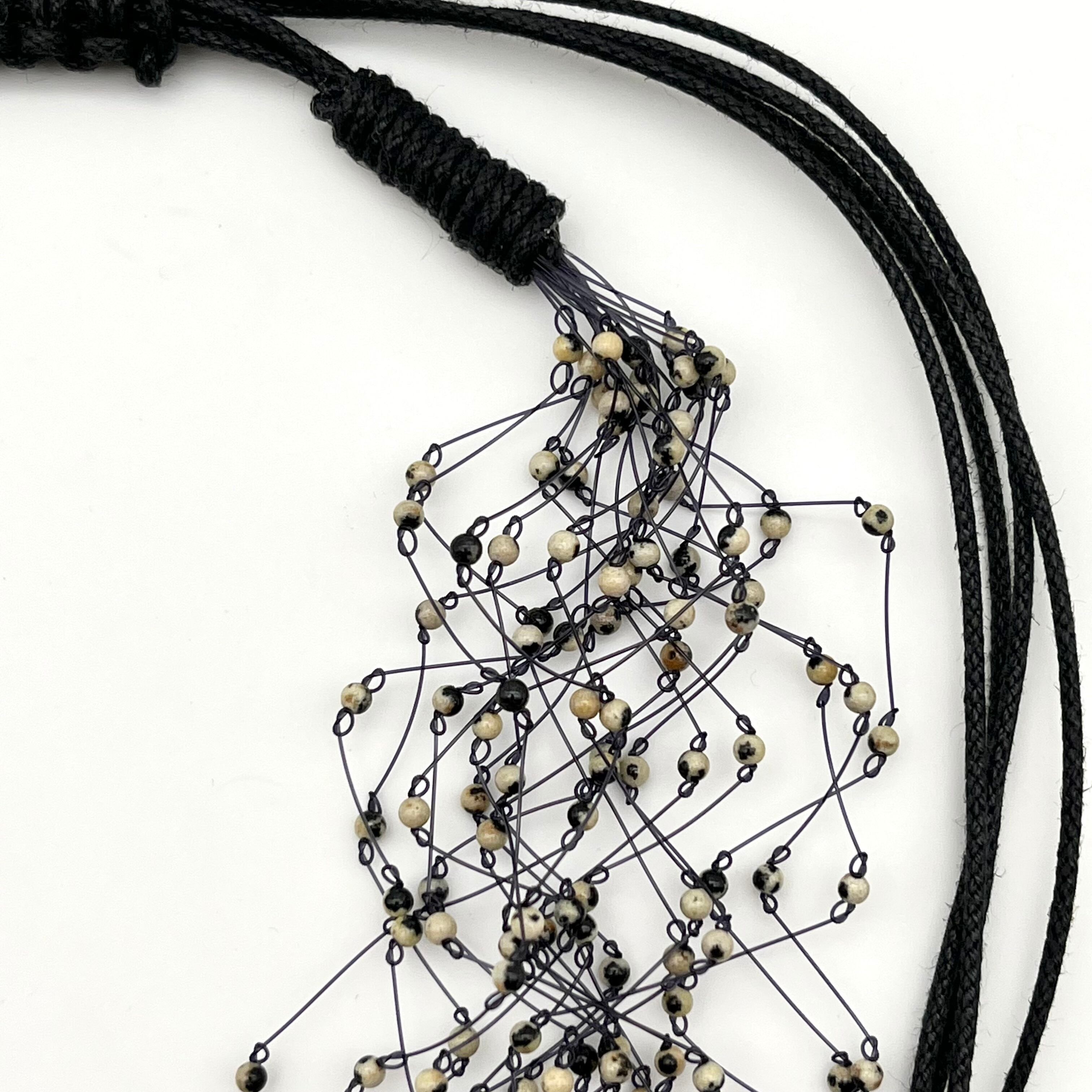 軽やかなデザインのダルメシアンビーズネックレス。長さ調節が可能なのでチョーカー、ロングネックレスとして、またきちんとしたスタイルから、Tシャツなどのカジュアルなスタイルまで、幅広くお楽しみいただけます。テグスを使用しているのでネックレス自体の重さも気になりません。バックスタイルも素敵。