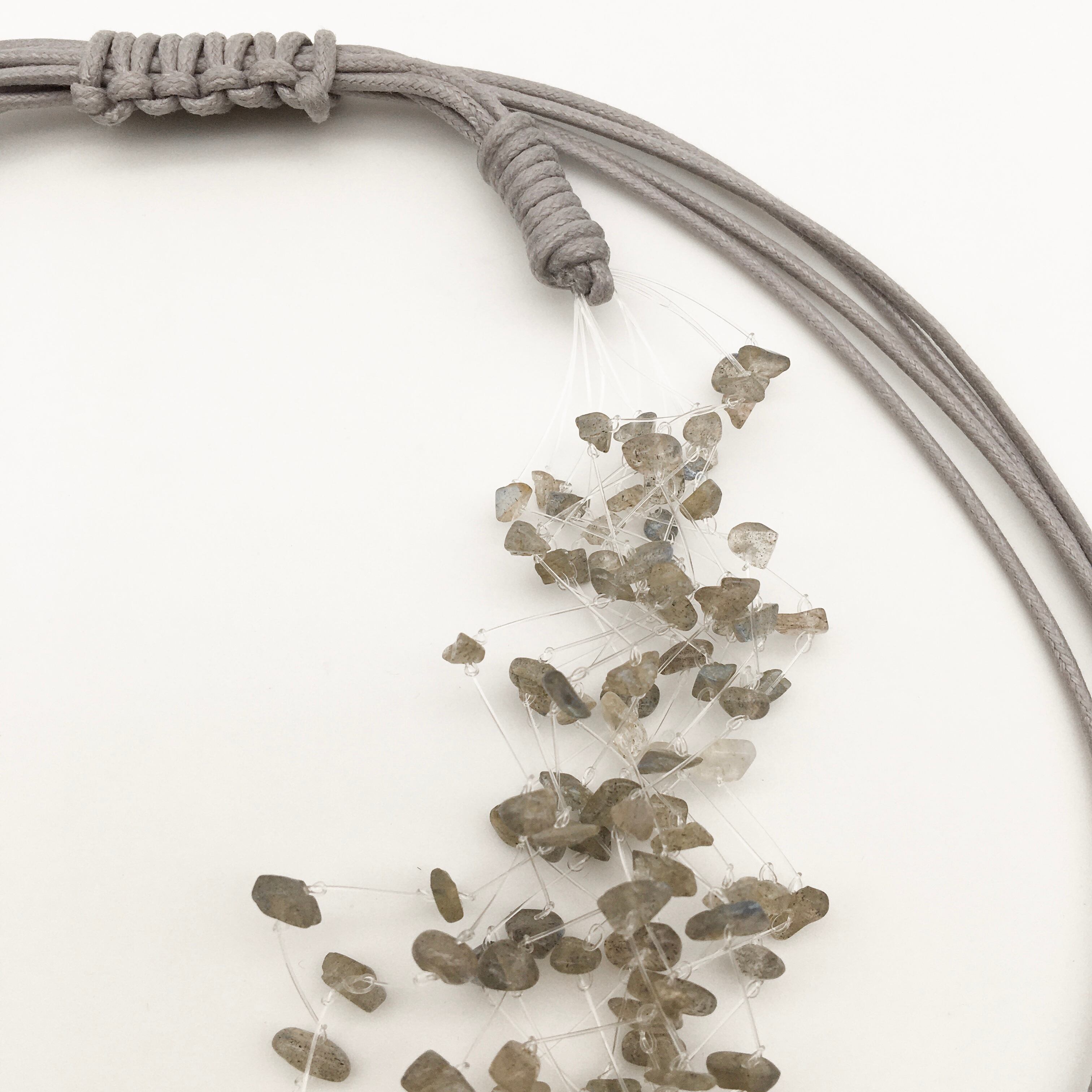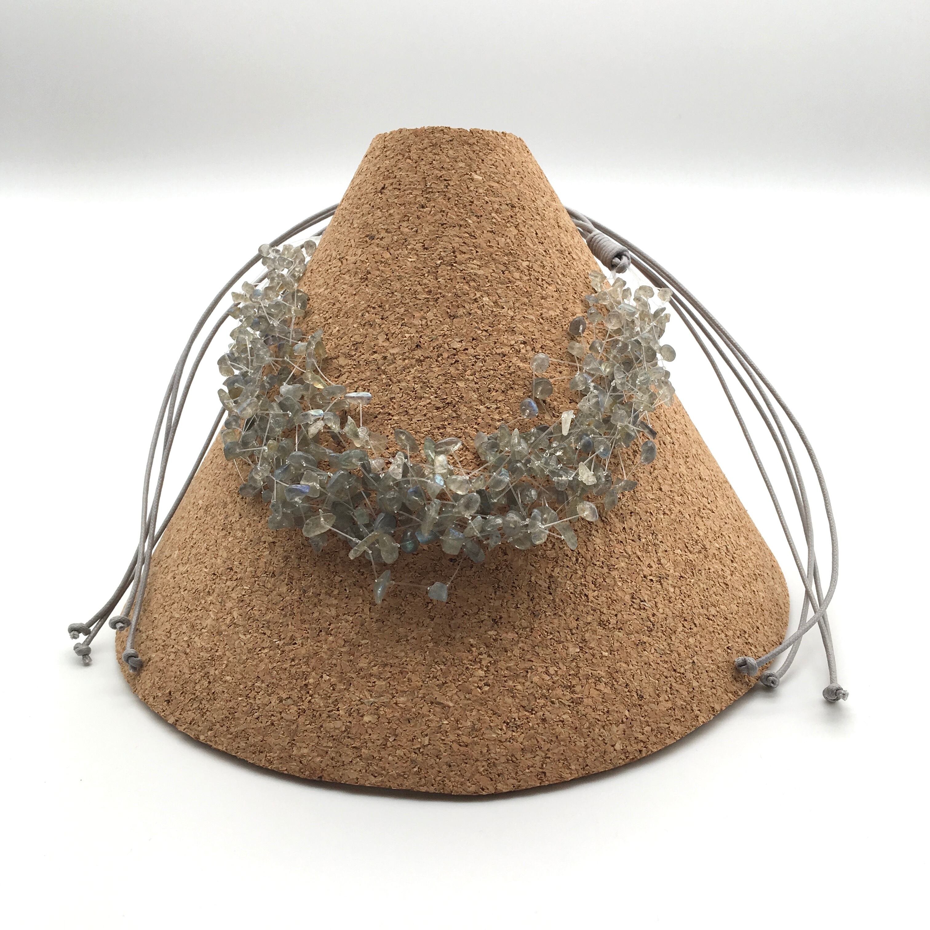 軽やかなデザインのラブラドライトさざれビーズネックレス。長さ調節が可能なのでチョーカー、ロングネックレスとして、またきちんとしたスタイルから、Tシャツなどのカジュアルなスタイルまで、幅広くお楽しみいただけます。テグスを使用しているのでネックレス自体の重さも気になりません。バックスタイルも素敵。